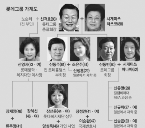 오늘 별세한 롯데그룹 신격호 명예회장에게는 현재 부인인 시게미쓰 하츠코, 아들인 신동주, 신동빈과 첫째 부인에게서 난 딸 신영자가 있으며... 또 서미경씨와의 관계에서 딸인 신유미가 있다. 형재자매 관계로는 푸르밀 회장인 신준호, 농심 회장인 신춘호일본 산사스의 신선호, 동화면세점의 신정희, 그 외 신경숙씨가 있다.