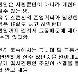 워터소믈리에가 말해 주는 수입물 이야기... 수입 물, 수입 생수는 현지에서는 특별하고 좋은 물일지 모르지만 길게는 몇개월씩 뜨거운 컨테이너박스에 보관되어 이동되면서 좋은 영양성분들이 사라지고 변질될 우려가 크다고 합니다... 비싼 수입 생수 마시지 말고... 우리 물 마십시다요~^^ 더보기 우리 아가들...^^ 우리 여섯 아가들...^^ (모두 찾으셨나요? ㅋㅋ) ※ 레인, 윈디, 주니어, 짱이, 둥이, 난이 레인(아빠냥) 처음 입양했을 때... 너무 이쁘죠...ㅠ,.ㅠ 근데 이 이쁘고 귀여운 모습은... 1년을 넘기지 못했으니...↓↓↓ 이런... 인상파로... ㅠ,.ㅠ 그래도 이뻐요... 하는 이쁜 짓이 똑같으니...^^ 울냥이들 중에서 가장 덩치가 크고 힘도 쎄면서... 항상 다른 아이들을 배려하는... 너무나도 심성이 착한... 제가 자고 있으면 조용히 옆으로 다가와... 팔베개를 하고 고로롱~ 잠이 드는... 모든 아가들을 이뻐하지만... 가장 사랑하는 울 레인...^^ 윈디(엄마냥) 저희 아가들은 모두... 장모종인 페르시안입니다... 미용을 하고 찍은 사진이라...^^ 정말 사랑스런 성격을 소유하고.. 더보기 반려견... 관절염은 사람뿐만이 아니라 개한테도 걸릴수 있는 병이다... 미국 위스콘신의 존엉거씨가 입양한 개.. 스퀩은 19살로 늙고 허약한데 관절염까지 걸려서 고통때문에 제대로 잠을 잘 수가 없었다고 한다... 우연히 물속에서는 그나마 덜 고통스럽고 편안하게 잘수 있다는 것을 알아내고 저렇게 몇시간동안 존엉거는 반려견인 스퀩을 물속에서 안고 재우고 있다... 반려묘를 키우고 있는 제 입장에서는 충분히 이해가 가는 내용이네요...ㅠㅠ 저도 살면서... 사람들에게 상처받는 것을 반려묘들한테 치유를 받곤 합니다... 가끔 모르는 분들은 반려동물을 키우고 있는 분들이 자신의 반려동물에게 정성스럽게 대하는 모습을 보곤... "사람에게나 잘하지... 뭐.. 그런 동물들에게 그리 돈을 쓰고 사랑을 쏟아...?!!!" 하시며 .. 더보기 이전 1 ··· 64 65 66 67 68 69 70 ··· 78 다음