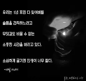 응답하라 1997... 중에서... 항상 절실하다... 그렇게 살려고 노력한다... 그런데... 그 결과들이 지치게끔 하는데... 어쩌지... 어쩌지... 더보기 좋은글 욕심만 버리면... 다른 사람과 비교하지 않으면... 하지만... 눈에 보이는 것을... 어찌... 더보기 데일카네기... 명언... 알고 있지... 하지만... 잊는 게 쉽지않네... 말처럼... 글처럼... 더보기 이전 1 ··· 67 68 69 70 71 72 73 ··· 78 다음